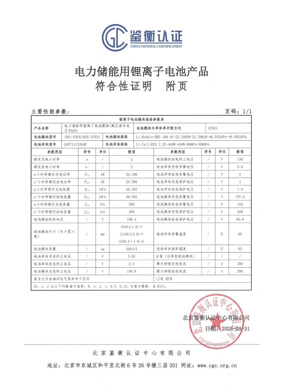 电力储能用锂离子电池产品符合性证明